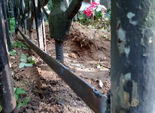В данном заказе мы столкнулись со следующей проблемой: из металлического ограждения, опоясывавшего периметр участка, была украдена секция. Нижняя же часть ограждения практически полностью прогнила, а потому и остальные элементы узора грозили в скором времени банально выпасть.